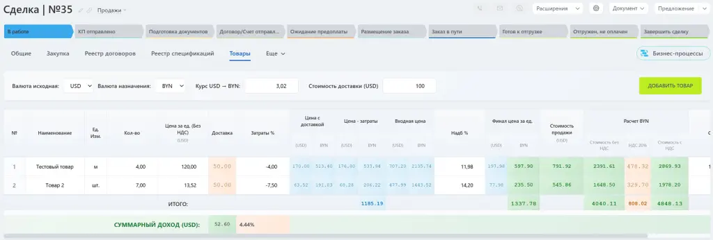 В карточке сделки добавлен раздел товары, включающий просчет стоимости на основании введенный сведений.