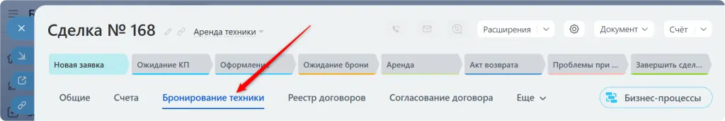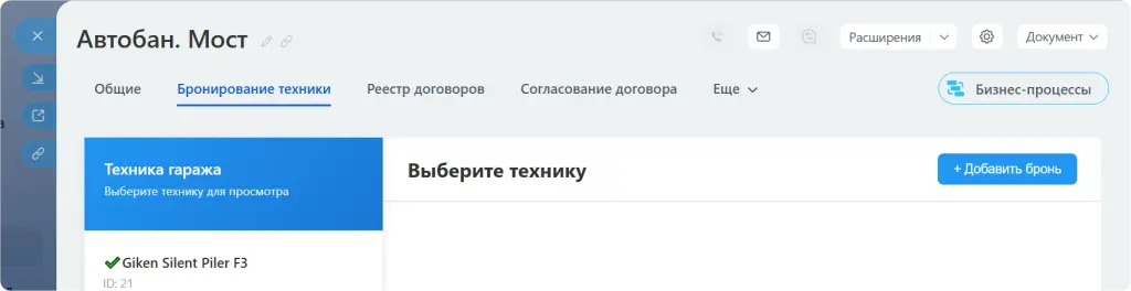 Новый раздел «Бронирование техники» появляется в сделках и смарт-процессе «Объекты».