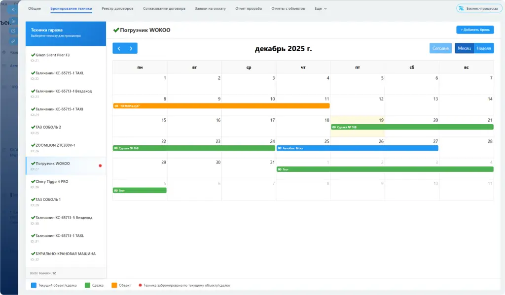 - Календарь занятости: Выберите технику — увидите свободные даты и резервы.