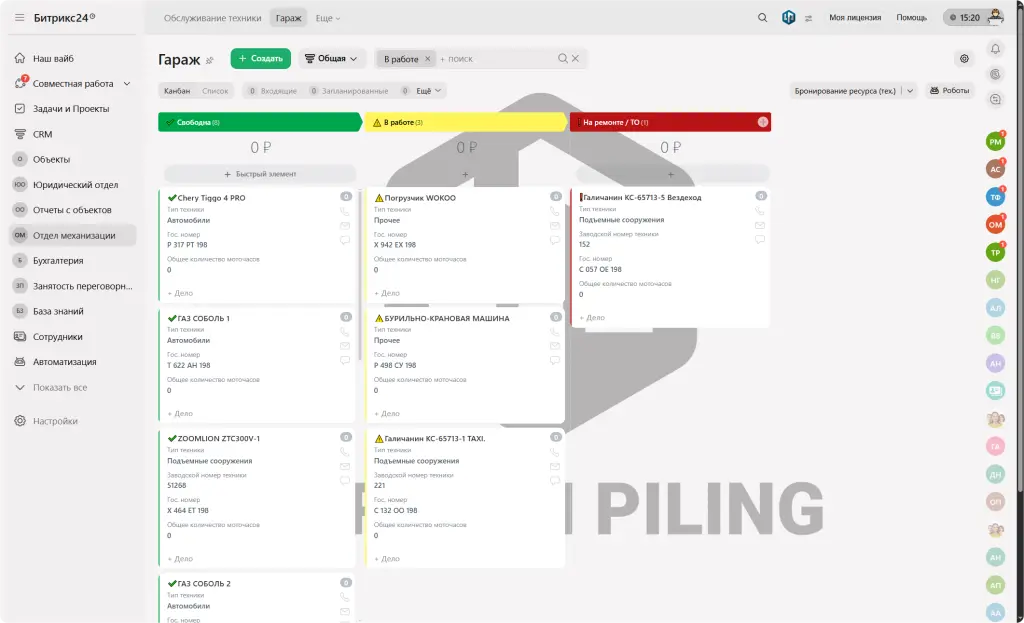 «Гараж» — полный контроль над спецтехникой и оборудованием. Отслеживайте статус, использование и координируйте график.