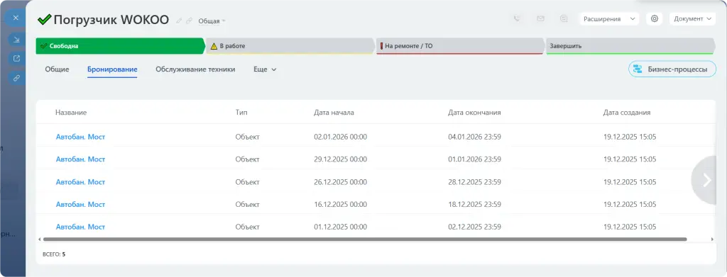 В карточке каждой единицы техники — вкладка с таблицей всех броней: даты, детали, история.